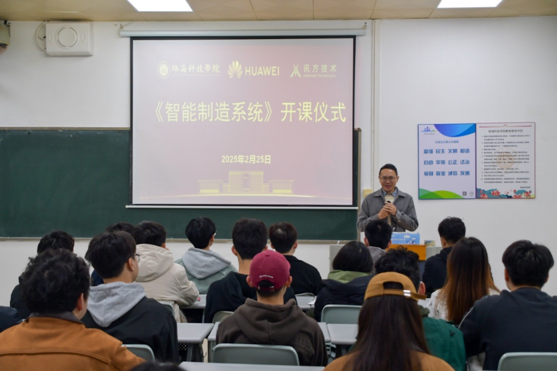 2月24日,计算机学院新学期开设的第一门产教融合型课程“智能制造系统应用”正式开课。学校与华为云计算技术有限公司校企全面合作以来,引进了华为高水平的工业软件课程体系,优秀企业工程师入校任教,充分实现教育与产业无缝对接,校企优质资源共享。计算机学院常务副院长刘衍珩和企业代表华为云计算技术有限公司珠海创新中心运营总监邓肯分别致辞,众多师生齐聚一堂,共同见证这一重要时刻。